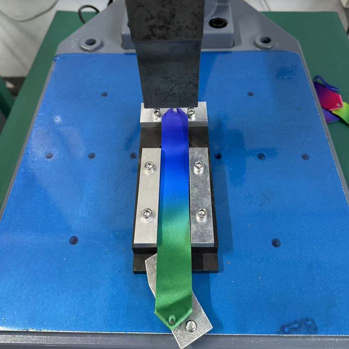 涤纶奖牌绶带切边并冲洞眼15K超声波切割与打孔一体机,是利用超声波切割工艺进行的,切三角边的同时打一个小孔,切边平整,圆孔边缘光滑,用超声波钢模效果更好,采用15K2600W超声波焊接设备进行切割并冲孔。