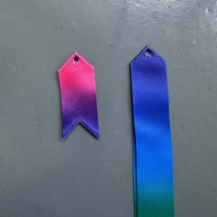 涤纶奖牌绶带超声波切边并冲洞眼效果图片,切割效果良好满足客户的要求。