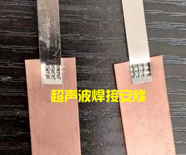 镍片与紫铜片超声波金属焊接机是利用超声波工艺进行焊接的,将镍片与紫铜片超声波金属点焊成型,超声波焊接效果牢固,适合用20K3000W超声波金属焊接机焊接。 镍片与紫铜片超声波金属焊接样品图片 镍片与紫铜片超声波金属焊接背面图片 镍片与紫铜片超声波金属焊接后强度与外观达到客户的要求,根据焊点面积大小设计模具,采用模具钢材质。 镍片与紫铜片超声波金属焊接机设备质保1年,超声波模具质保三个月,整机终身维护。