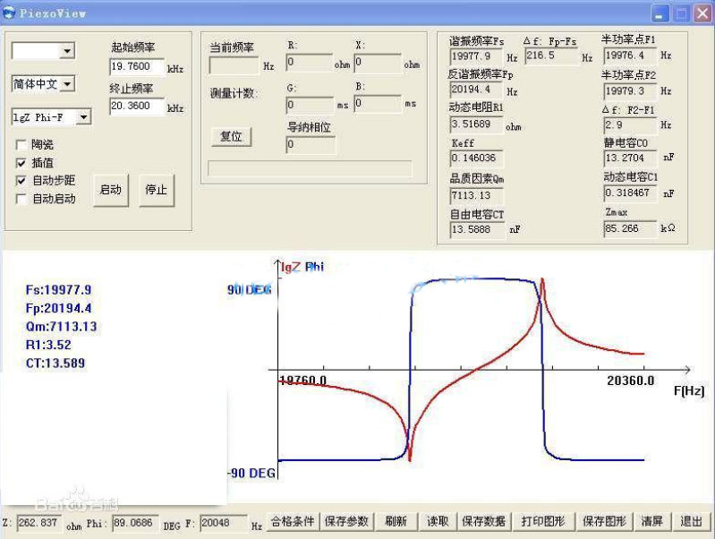 7、Zmax:反谐振阻抗,正常的情况下,一个换能器的反谐振阻抗都在几十千欧姆以上,如果反谐振阻抗比较低,往往振子的寿命比较短。