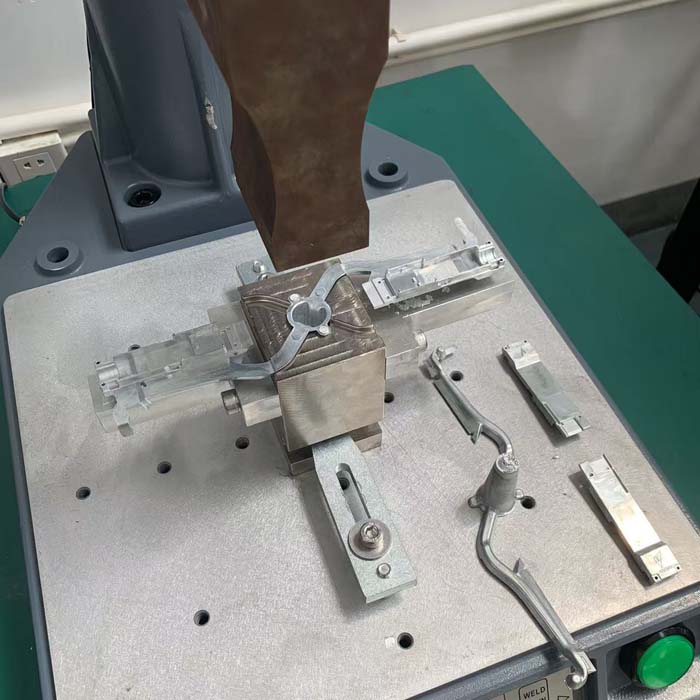 锌合金压铸件去水口超声波振落分离机是利用超声波工艺进行切水口分离的,将锌合金注塑件分离振落出来,超声波切水口效果良好,适合用15K2600W台式超声波塑料焊接设备振落。 锌合金压铸件去水口超声波振落分离效果图片 锌合金压铸件去水口超声波振落分离后,无毛刺且光滑达到客户的标准。 超声波模具和底模根据锌合金枝干大小设计,采用钢材质,底模加了电镀层,人工放取依次进行超声波振落分离生产。 锌合金压铸件去水口超声波振落分离机设备质保1年,超声波模具质保3个月,整机终身维护。